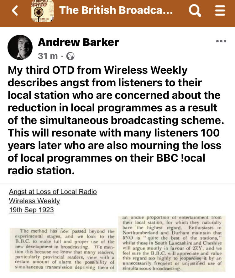 Meanwhile, on September 19th Andrew Barker posted an interesting snippet on social media. He’s a radio historian who has for the last couple of years published regular “On The Day” (OTD) news clippings from the archives to celebrate radio’s centenary. Andrew found this prophetic gem. The FB link is below this screenshot.