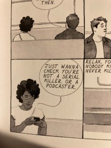 He then exclaims, “Are you Googling me!?!” Her reply appears in this frame from the novel. Classic. The reverse implication being that podcast producers are a bunch of serial killers or worse. Oh dear.