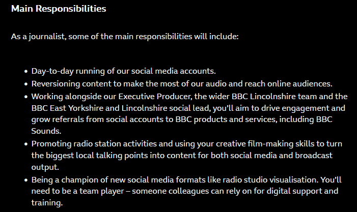 “You will be the champion of new social media formats like radio studio visualisation…” And be a “clip-monkey” (my turn of phrase) and put video clips of the breakfast and mid-morning shows out onto socials… All so that the listeners can “see” or visualise the radio.